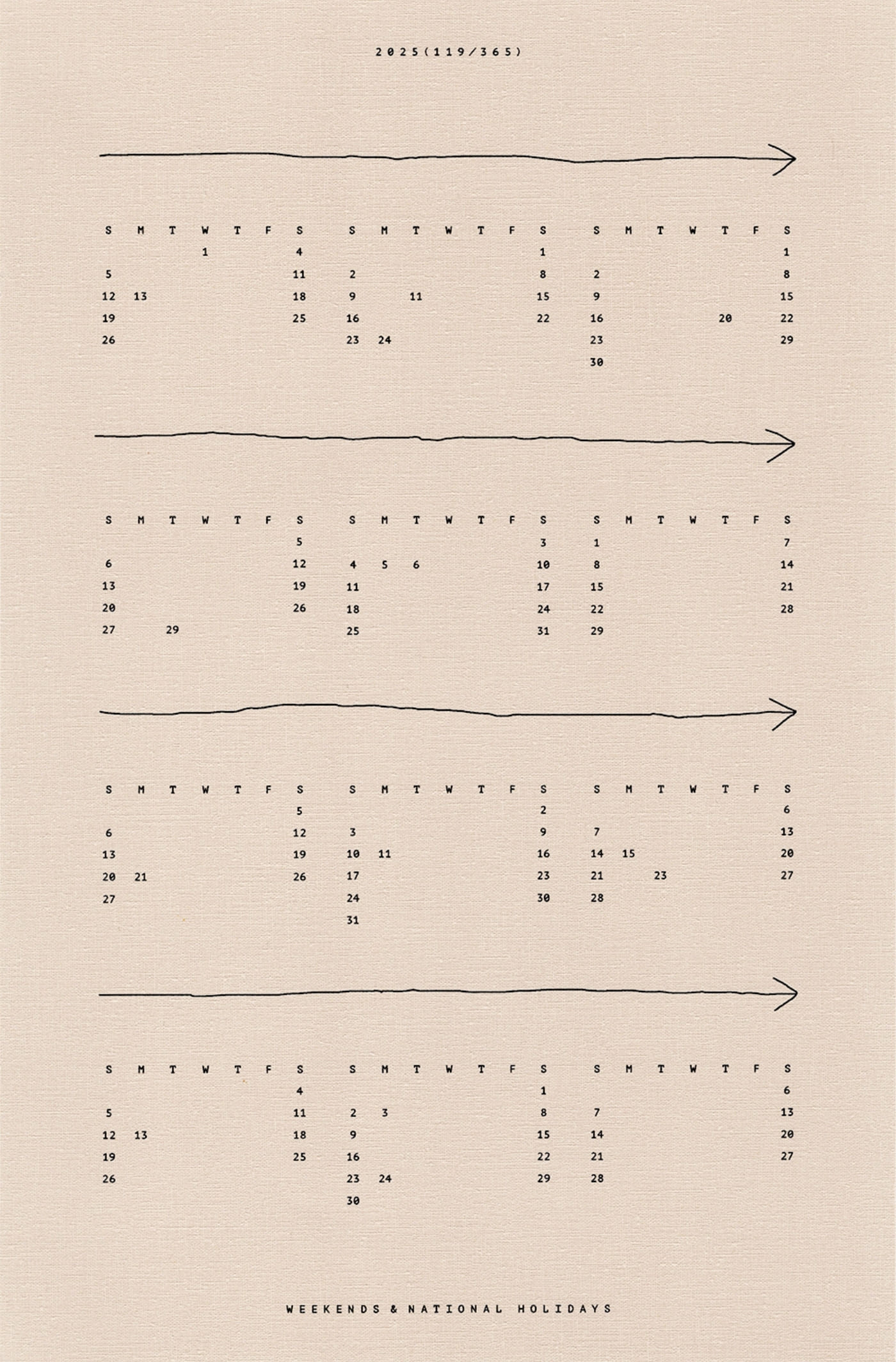 僕は子どもの頃から平日が嫌いだった。幼稚園も学校も行きたくなくて、カレンダーの休日に縋るようにして生きていた。ずっと祝日だけだったら良いのに。その感覚は大人になった今も根本的にはあまり変わっていない気がする。世の中にも同じように感じている人はきっと多いはずだ。このカレンダーで平日が減るわけでも何でもないが、気持ちは少し穏やかになるかもしれない。一緒に頑張ろう。