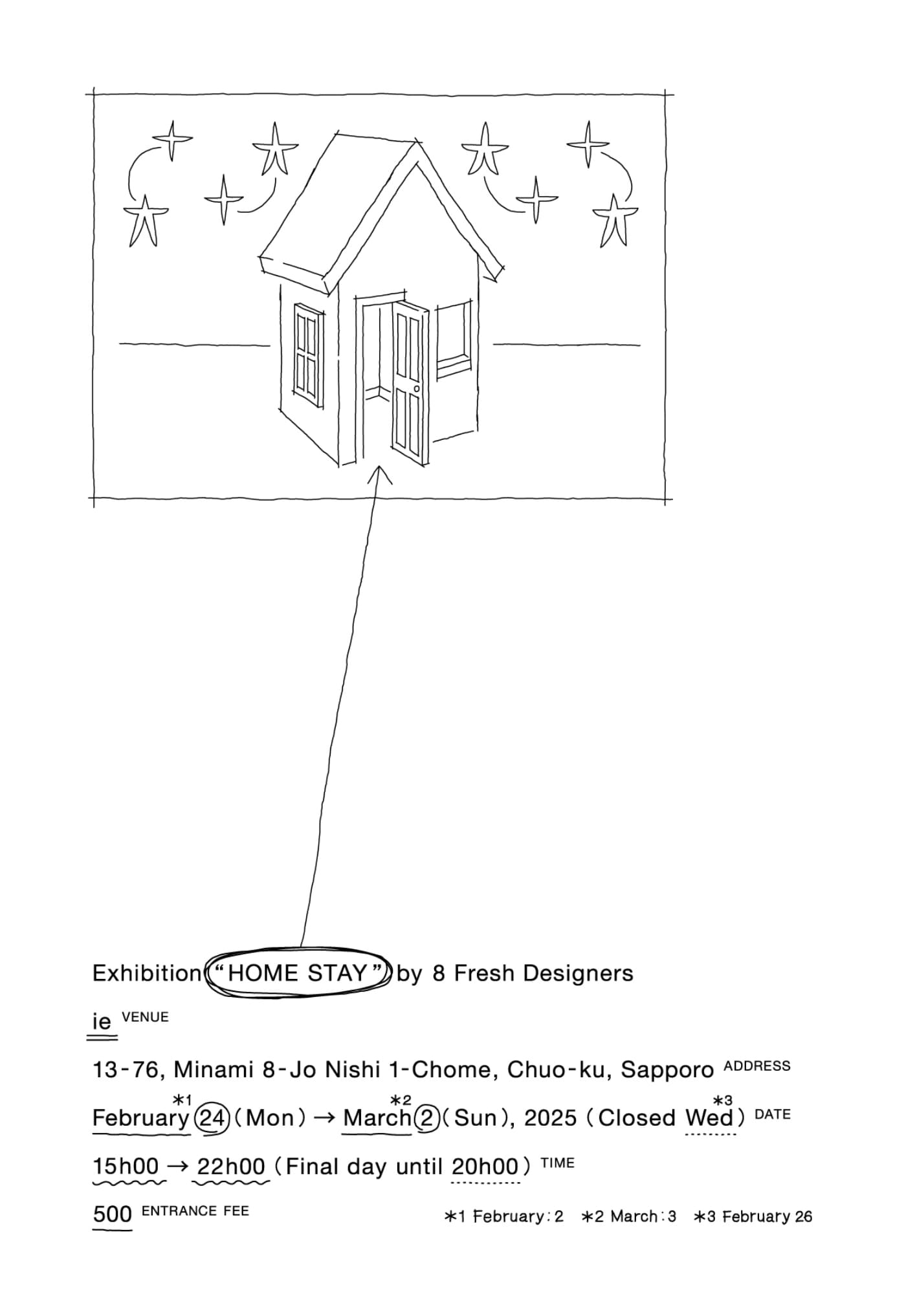 フライヤーはポストカードサイズで制作。ビジュアルの家の上に輝く星は出展者を表しており、五芒星は先輩を、四芒星は後輩をイメージしている。見た目上は四芒星の方が角が1つ足りないが、足りないからといって五芒星より劣っているわけではない。全て同じく輝いていて、それぞれの美しさがあるのだ。年齢差があろうがなかろうが、全員が輝いている。そんな展示を目指した。